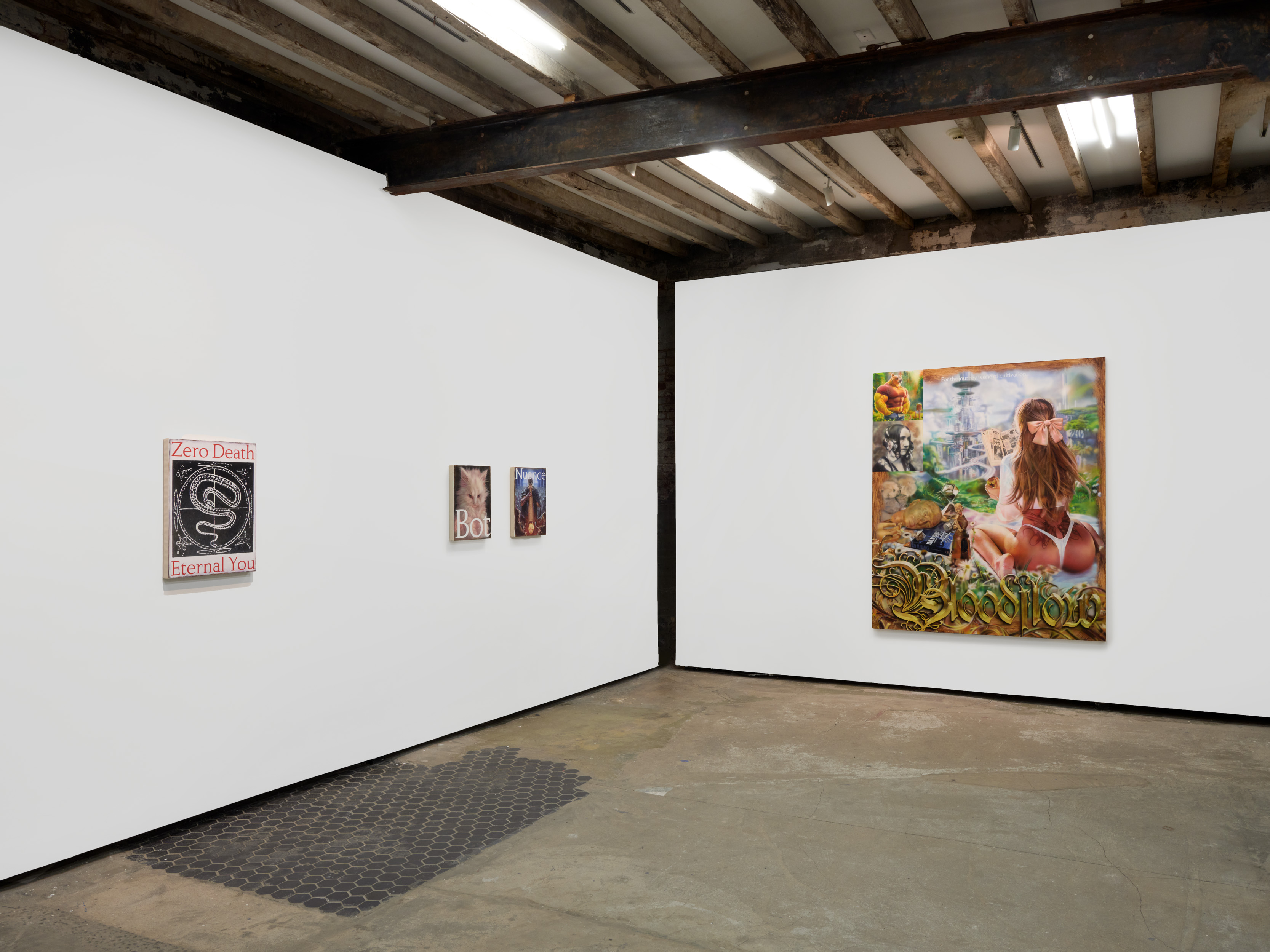 Human ingenuity is always in tension with the danger of unintended consequences. In I have no mouth, and I must scream, the title floats above a luminously backlit man kissing the bottom of a nude woman, as seen through the heart-shaped opening of a cave below them. The title references the eponymous short story by Harlan Ellison, which is set in a post WWIII hellscape where a super computer has killed all but five individuals, only to vengefully torture them. What does desire look like, and can it be controlled? Why might these paintings be funny? In Zero Death, Eternal You, the text sandwiches a hermetic diagram by Italian philosopher Giordano Bruno (1548-1600). It was used as the cover for his book, The Seal of Seals, an elaboration on Bruno’s theories on the human mind and its extraordinary powers.